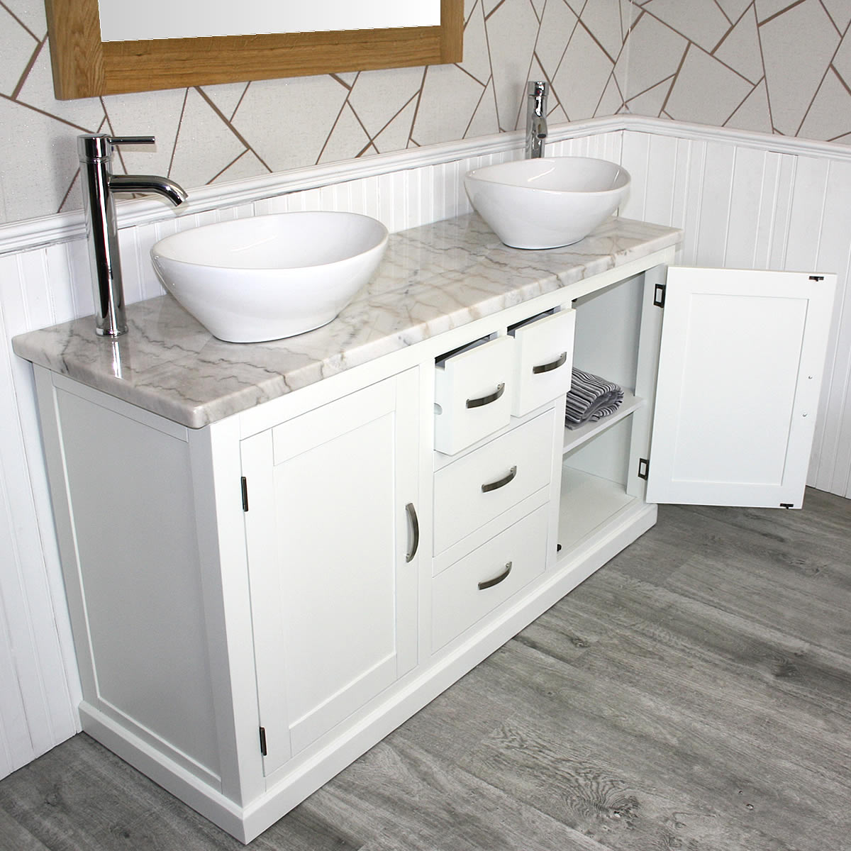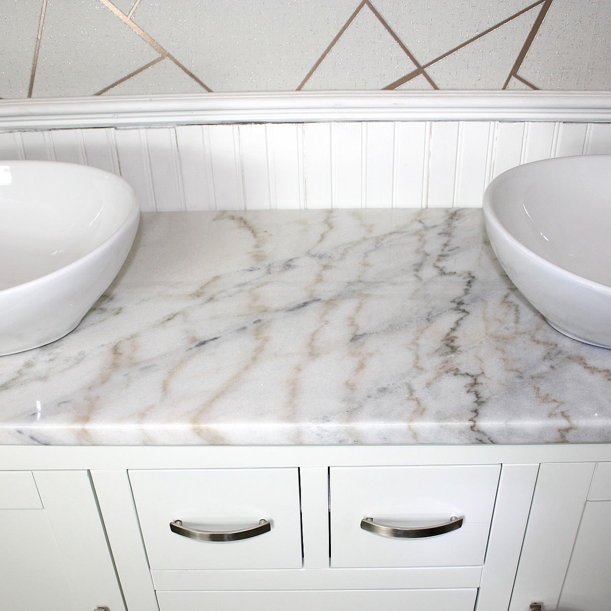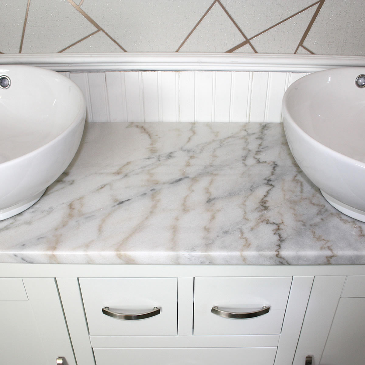 - One stunning double pre-drilled white marble work top.