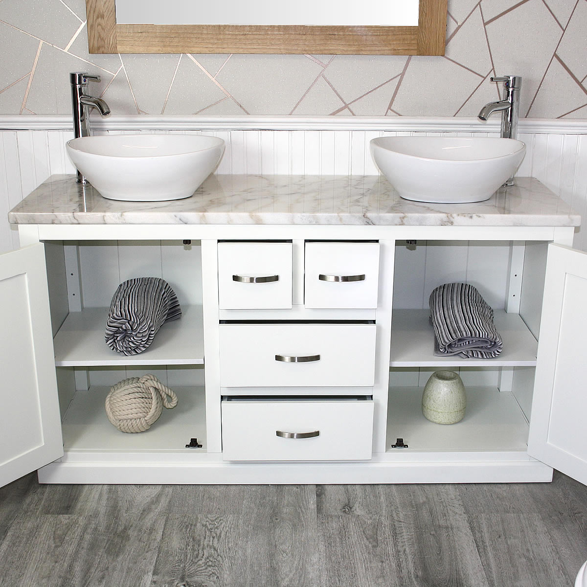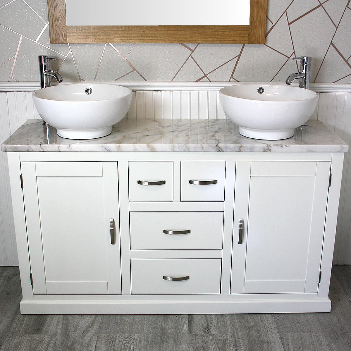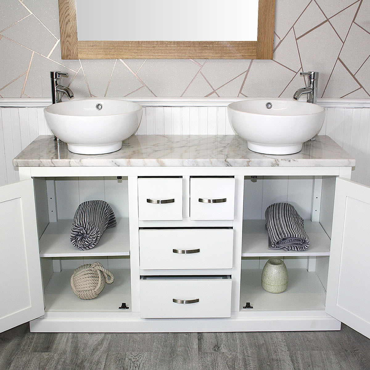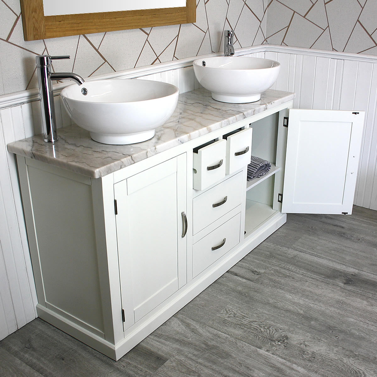 - One stunning double pre-drilled white marble work top.