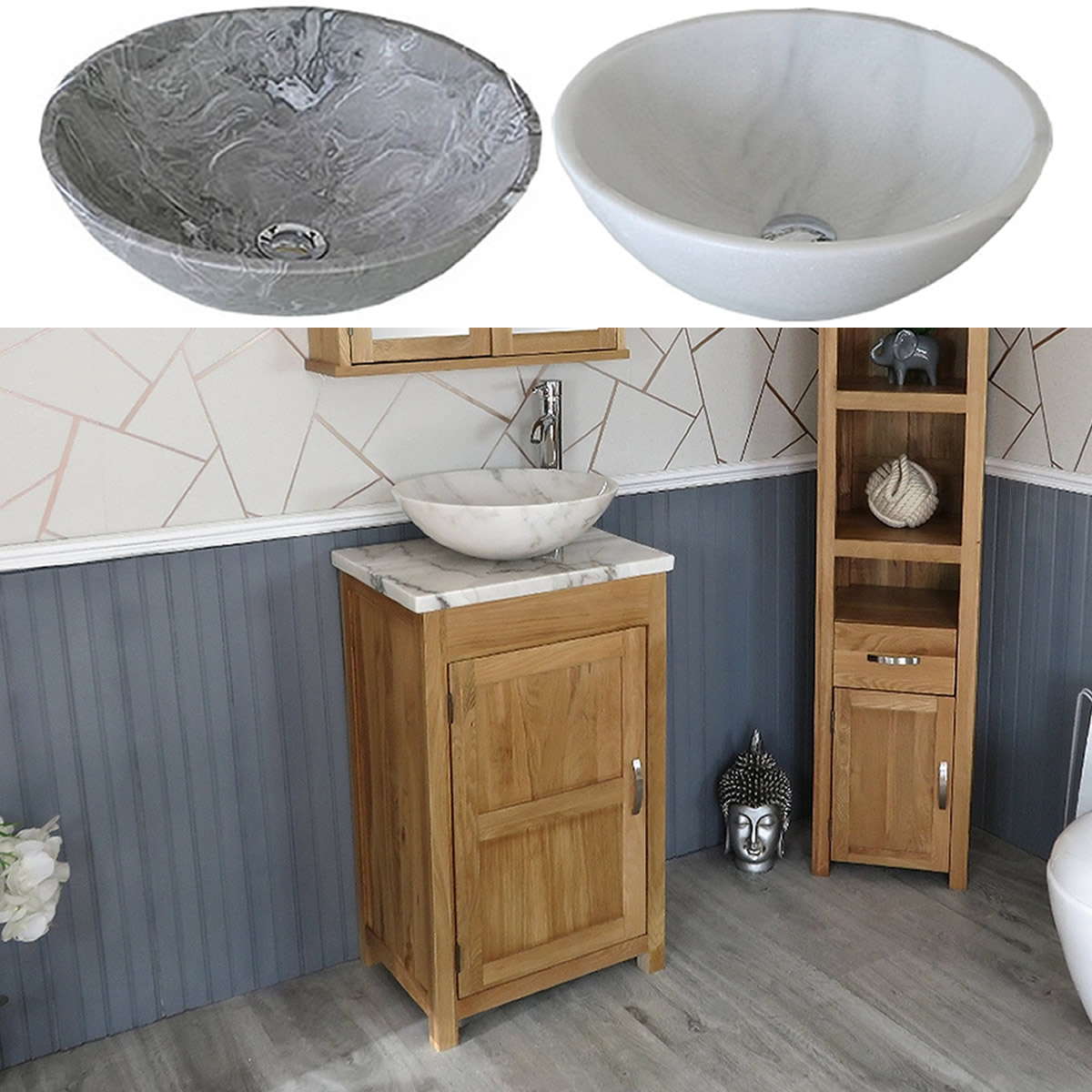 - A beautiful heavy marble bowl of choice, see the dimensions of each basin below: