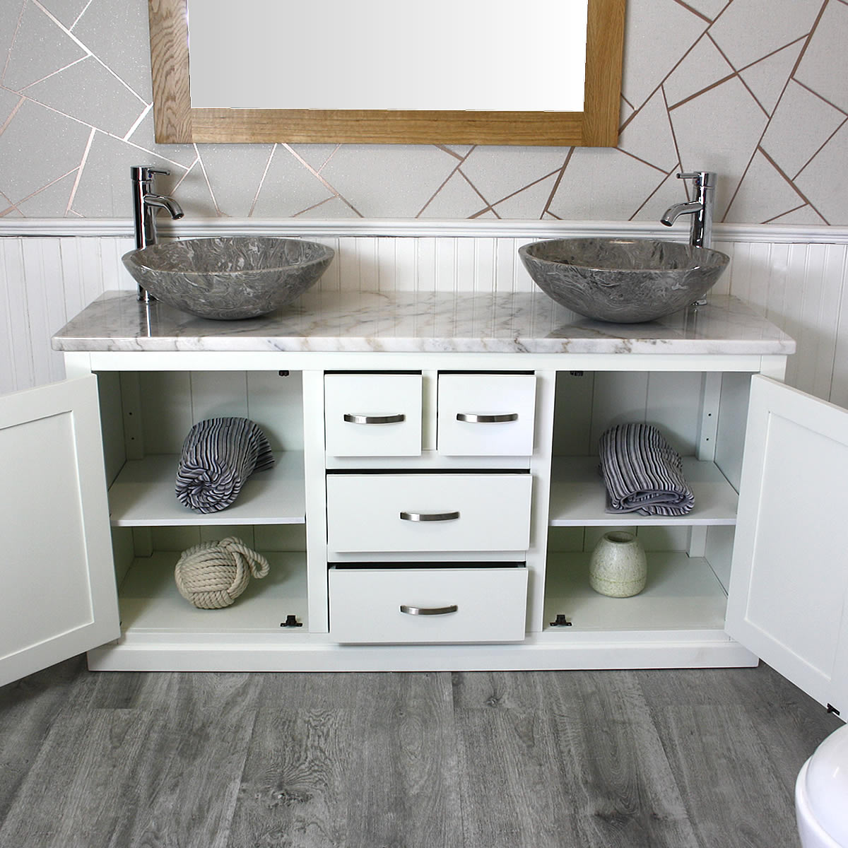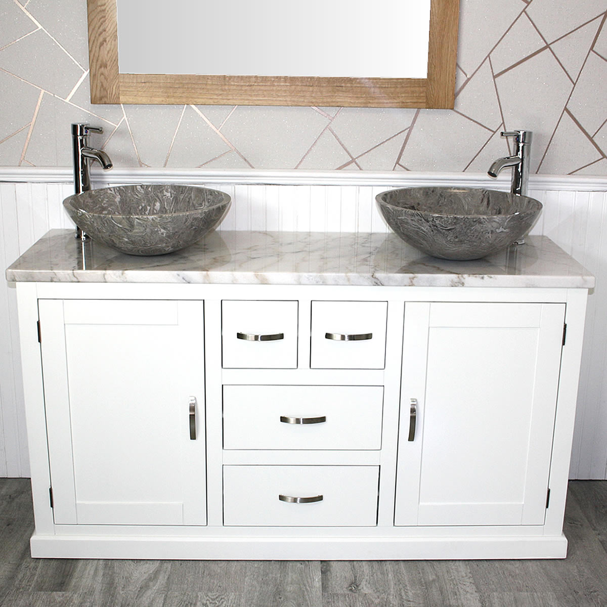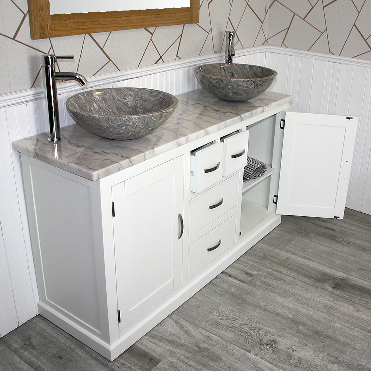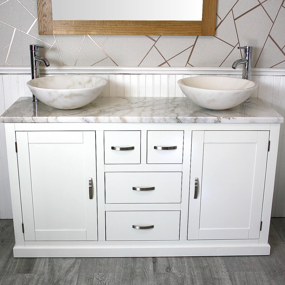 - Two round curved marble bowls of choice, see the dimensions of each basin below: