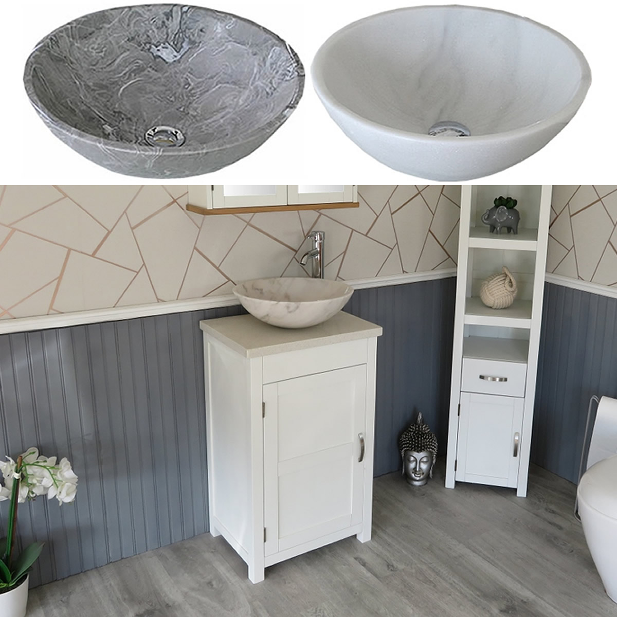 - A beautiful heavy marble bowl of choice, see the dimensions of each basin below: