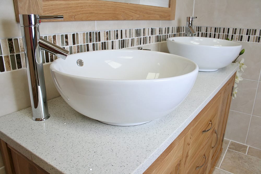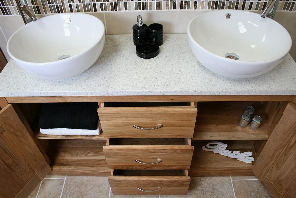 This double solid oak two cupboard (with adjustable shelves) three drawer vanity unit comes complete with two stylish round ceramic bowl sets and white quartz pre-drilled work top and is fully assembled and ready to install, this complete bathroom vanity unit has an RRP of £999.99.