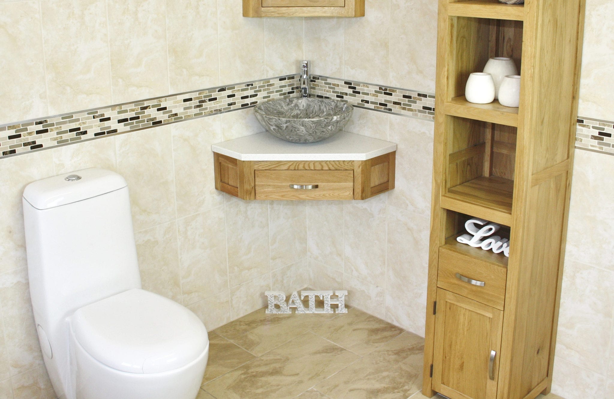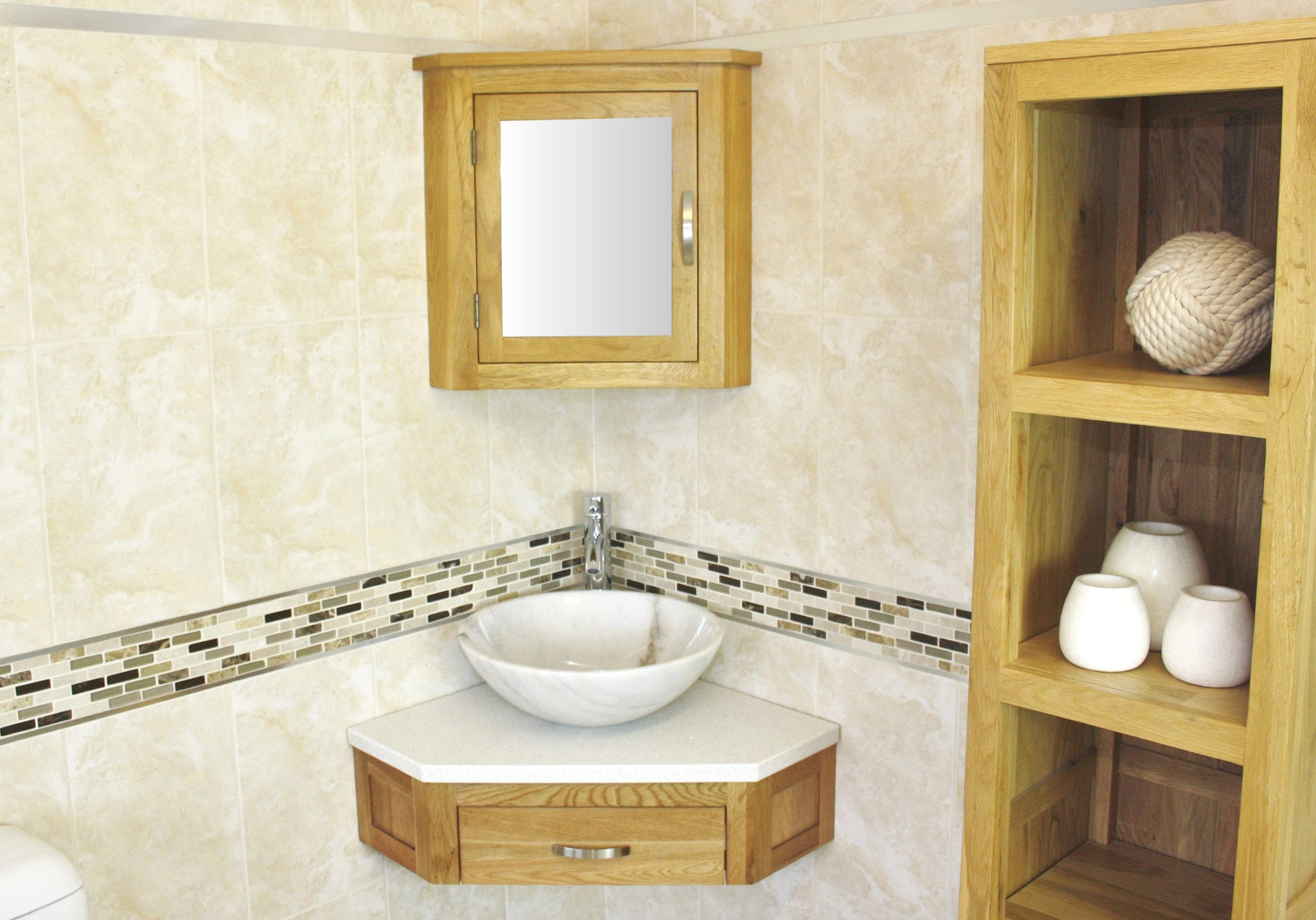 Mirrored corner cabinet and tall storage unit in image are not included but are optional extras, please see below.