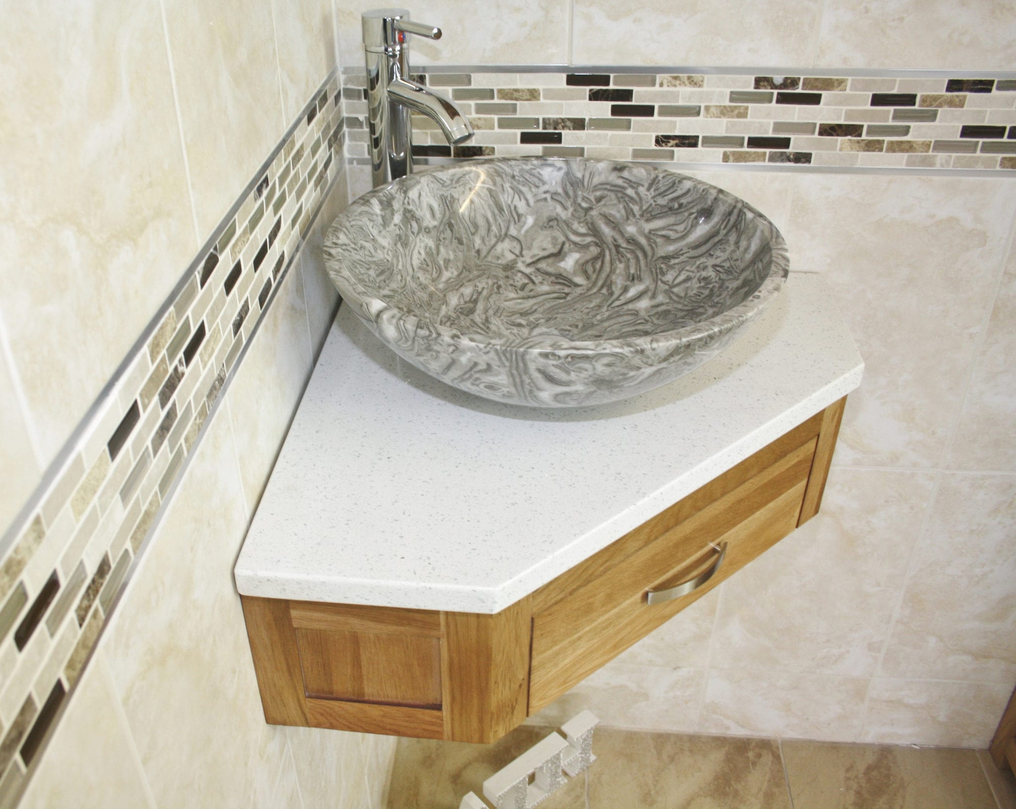 - A stunning pre drilled sparkling white quartz top.